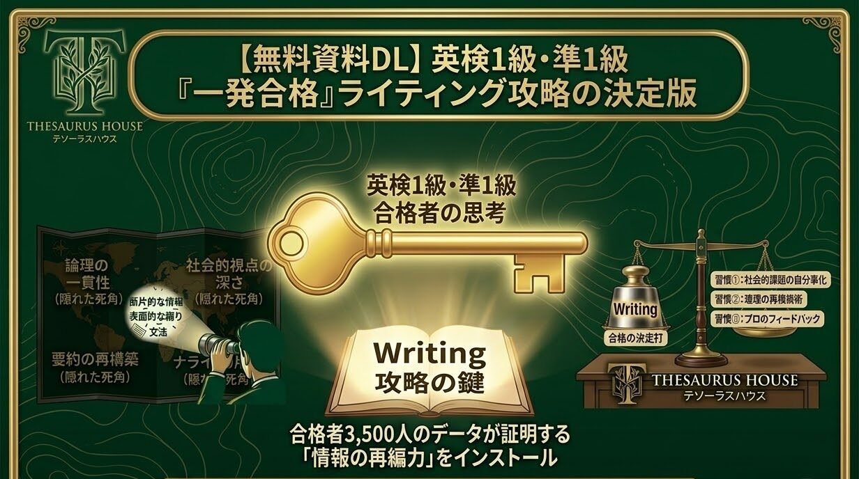 無料:「英検1級・準1級一発合格を勝ち取るライティング・要約問題のコツ」 資料ダウンロードは、下のフォームよりお願いいたします。フォーム送信後、メールアドレス宛にダウンロードURLをお送りいたします。 フォームはこちらhttps://thesaurus-house.jp… -